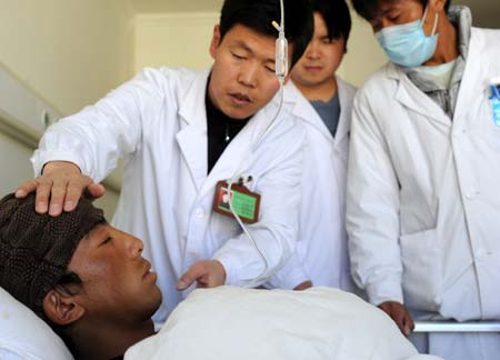 A wounded passenger is treated at the People's Hospital in Lhasa, capital of southwest China's Tibet Autonomous Region November 18, 2008. A passenger bus plunged into a valley last Friday in Nagqu prefecture, leaving 18 dead and 29 injured. The wounded have been sent to major hospitals in Lhasa and police are investigating the cause of the crash.[Xinhua]