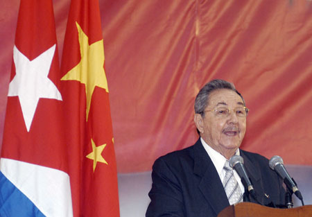 Cuba's President Raul Castro addresses his Chinese counterpart Hu Jintao and Chinese students attending language school in Cuba, in Tarara on the outskirts of Havana November 18, 2008. [Agencies]
