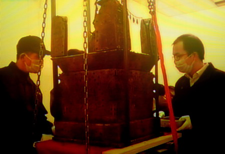 A video grab show two archeologists remove the miniature pagoda, which is believed to contain a part of Buddha's body in Nanjing, Jiangsu province November 22, 2008. [Xinhua]
