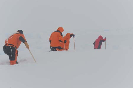 Several members of the ice detection team walk on the ice to search for routes while China's ice breaker Xuelong or "Snow Dragon" is blocked by thick ice around the Antarctica during her 25th expedition to Antarctica, on November 24, 2008.[Xinhua]
