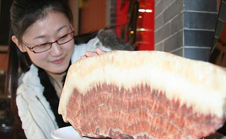 Updated: 2008-12-01 21:07 ![]() A visitor looks at a flesh-shaped stone in a restaurant in Xingtai city, north China's Hebei province, December 1, 2008. The stone came from a kind of natural rock colorating with other minerals during the geological movement. [Asianewsphoto] |