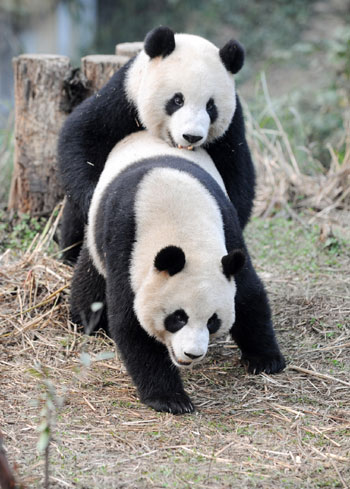 Tuantuan and Yuanyuan, a pair of giant pandas ready for a maiden journey to Taiwan, play at the Bifengxia Base of the Chinese Giant Panda Research and Protection Center in Ya'an County, southwest China's Sichuan Province, December 3, 2008. As a gift by the mainland to Taiwan, the panda pair is expected to leave for the Mucha Zoo in Taipei in one month at the earliest though the exact date has yet to be finalized, according to reports. [CFP]