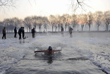 A winter swimmer swims in icy water during early morning at a park in Shenyang, northeast China's Liaoning province December 13, 2008. The local temperature hit minus 12 degrees Celsius (10 degrees Fahrenheit) on Saturday, local media said. [Agencies]