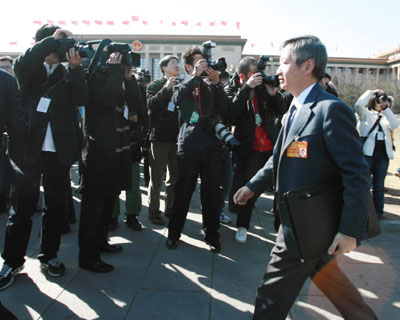 A member of the First Session of the 11th National Committee of the Chinese People's Political Consultative Conference walks towards the Great Hall of the People in Beijing March 3, 2008. The session opened Monday afternoon. [Xinhua]