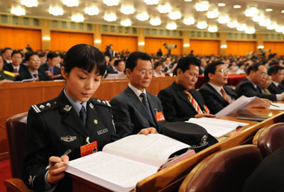 NPC deputies listen to Premier Wen Jiabao delivering his government work report at the Great Hall of the People in Beijing March 5, 2008. [Xinhua]