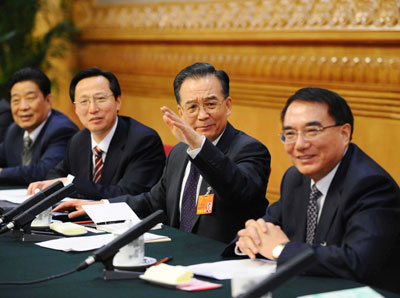 Chinese Premier Wen Jiabao (2nd R) meets with deputies to the First Session of the 11th National People's Congress (NPC) from northeast China's Jilin Province in Beijing, capital of China, March 9, 2008. Wen Jiabao joined in the panel discussion of Jilin delegation on Sunday during the First Session of the 11th NPC. [Xinhua]