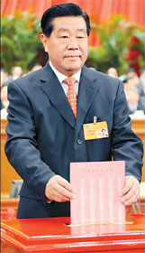 The top political advisory body yesterday elected a new chairman, vice-chairpersons and standing committee members representing a wide social strata. Jia Qinglin was re-elected chairman at the first session of the 11th Chinese People's Political Consultative Conference (CPPCC) National Committee which ends today. Also elected were 25 vice-chairpersons, a secretary-general and 298 standing committee members. Wang Gang, a member of the Political Bureau of the Communist Party of China (CPC) Central Committee; Li Jinhua, auditor-general of the National Audit Office; Sun Jiazheng, minister of culture; and Deng Pufang, president of the China Disabled Persons' Federation, were among the 13 new vice-chairpersons. CPPCC vice-chairpersons hold a rank equivalent to vice-premiers, and the standing committee members consist of a number of former State ministers and governors as well as representatives of all the 34 member groups. The CPPCC consists of representatives of the CPC and non-Communist parties, those without party affiliation, and representatives of people's organizations, ethnic minorities and various social strata. It also has representation of compatriots in Hong Kong, Macao and Taiwan as well as returned overseas Chinese. Each CPPCC administration serves a five-year term. "The CPPCC National Committee will play a more important role in strengthening socialist democracy," Li Jinhua told China Daily yesterday.