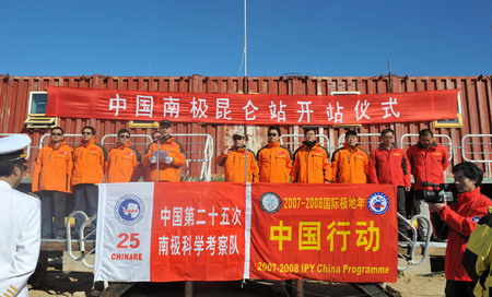 Members of China's 25th Antarctic expedition team attend the opening ceremony of the Kunlun station, the third Chinese Antarctic base and the first in inland Antarctica February 2, 2009. [Xinhua]