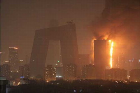 The north wing building of the new CCTV tower is on fire, which is still spreading, in downtown Beijing Monday February 9, 2009. Police have conducted traffic control around the scene. [people.com]