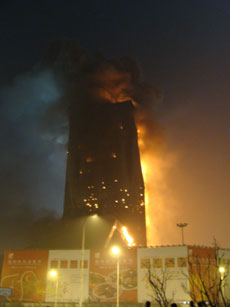 The north wing building of the new CCTV tower is on fire, which is still spreading, in downtown Beijing Monday February 9, 2009. Police have conducted traffic control around the scene. [Xinhua]