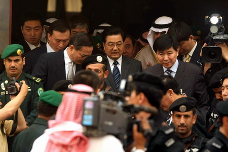 Chinese President Hu Jintao (C) is escorted during his visit to Riyadh Cement Company in Riyadh February 11, 2009. Private Saudi company Riyadh Cement Co said on Tuesday it had awarded a contract to China's Sinoma International Engineering Co to double its cement production capacity by the end of 2009. Hu is on a three-day state visit to Saudi Arabia. [Agencies]