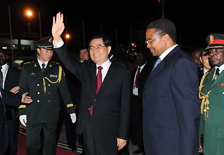 Chinese President Hu Jintao (3rd R, front) is greeted by Tanzanian President Jakaya Mrisho Kikwete (2nd R, front) upon his arrival at the airport in Dar es Salaam, Tanzania, Feb. 14, 2009. Hu arrived here on Saturday night for a state visit to Tanzania. [Xinhua]