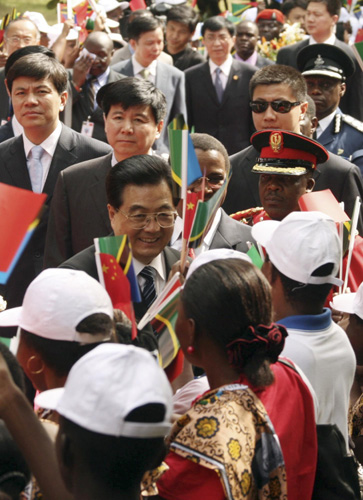 Chinese President Hu Jintao (C) is welcomed on his arrival at the State House in Dar es Salaam February 15, 2009. [Agencies]