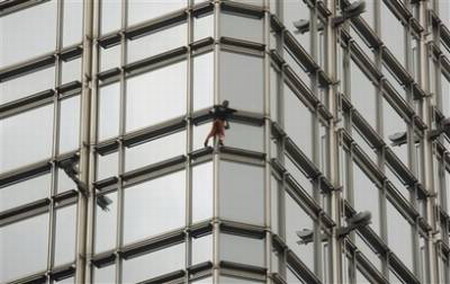Alain Robert, dubbed the French spider-man, has scaled dozens of tall structures without ropes or harnesses, including the Eiffel Tower in Paris, the Empire State Building in New York and Malaysia's Petronas Towers in Kuala Lumpur. It took Robert about 40 minutes Tuesday to scramble up the downtown Cheung Kong Center, the flagship building of Hong Kong's richest man, Li Ka-shing. Upon reaching the top of the 885.83-foot (270-meter) building, Robert waved to a crowd of spectators on the ground below. The 46-year-old said police officers questioned him after the ascent, but released him without any charges. Robert said he hoped his climbs could help bring attention to the world's environmental problems. "The global warming is something that is going to affect the next generation," Robert told reporters on the ground level. "The future is really compromised if we are not doing anything." Police spokesman Lawrence Li said they were aware of a man outside the building and that he was safe. Li said officers did not press any charge against the man. It's the fourth time Robert has mounted a skyscraper in Hong Kong. He scrambled up the city's 45-story Four Seasons hotel last year. |