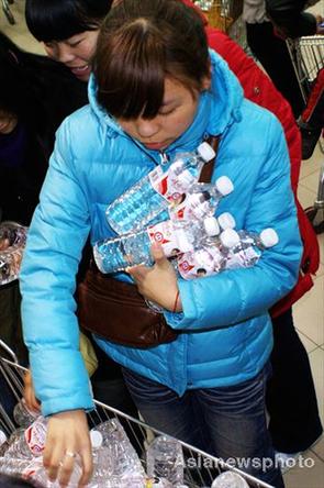 A woman holds several bottles of water in a supermarket in Yancheng, Jiangsu province Friday, Feb 20, 2009. The price of bottled water has shot up because of the increasing demand. [Asianewsphoto]