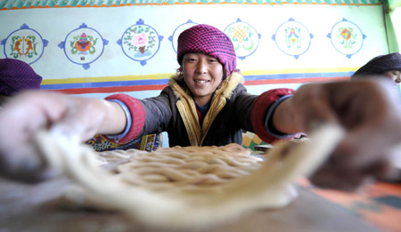 Updated: 2009-02-22 21:36 LHASA -- After hanging on the door strips of hada, a white long silk scarf considered as a token of blessing, Degyi Drolkar paced excitedly through her new, 198-square-meter home in Gongka Township near Lhasa as she decorated for the Tibetan New Year which falls on Wednesday.