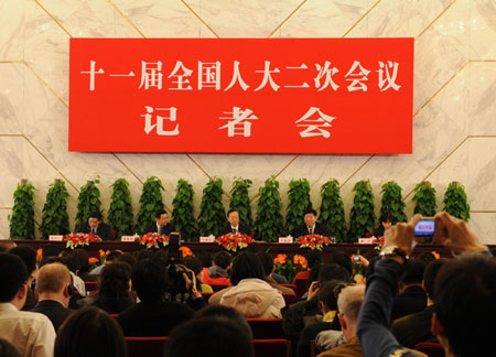A press conference is held on "Boosting domestic demand, employment and economic growth", attended by Minister of Commerce Chen Deming (2nd L), Minister of Industry and Information Technology Li Yizhong (3rd L) and Minister of Human Resources and Social Security Yin Weimin (2nd R) on the sidelines of the ongoing NPC annual session, in Beijing, March 10, 2009. [Xinhua]