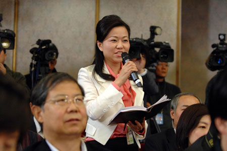 A journalist raises a questionduring a press conference on "Boosting domestic demand, employment and economic growth" on the sidelines of the ongoing NPC annual session, in Beijing, March 10, 2009. [Xinhua]