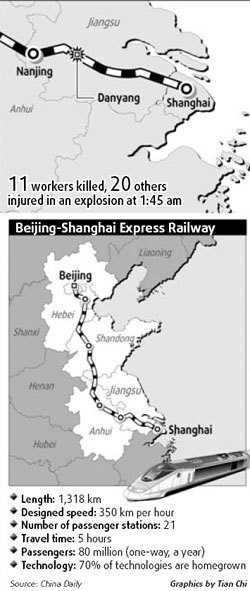 DANYANG, Jiangsu: Eleven workers building an express railway between Shanghai and Nanjing were killed in an explosion, allegedly caused by aluminium powder, Wednesday morning. At 1:45 am, the middle part of a U-shaped dormitory building, home to hundreds of workers, about 2 km away from the construction site in Huiji village, Lucheng town of Danyang, was blown up, killing 11 and injuring 20. "There was a huge bang, jolting us awake," said a 37-year-old worker surnamed Feng from Henan province who lives in the left wing of the building. "There was a small fire and we rushed into the debris to pull out people," he told China Daily Wednesday. Police and firemen arrived about 40 minutes later, he said. A local villager surnamed Wang said the whole village heard the explosion. "The glass windows of neighboring houses were shattered to pieces and a window pane of another house about 10 to 20 m away dropped as well," he said. Zhang Liugou, director of the local public security bureau, said that the explosion tore down a part of the building, home to 48 workers, mostly from Guizhou province. Seventeen workers were asked to step out of the building to haul iron bars to the construction site minutes before the explosion. Eleven people, including a contractor, died on the site or soon after being rushed to local hospitals. Ye Wenzao, another worker from Taizhou, said most of the 48 housed in the site joined work only about 20 days ago. "They were carpenters," he said. Xiao Quan, the provincial government's spokesman, said that the 20 injured were in a stable condition. "Aluminium powder, left in the building, caused the explosion," Xiao said. "The building used to be an aluminium producing factory." Xiao said that the explosion might be caused by humidity or the substance catching fire. "We are still investigating the cause," he said. The building housed a garment factory after the aluminium plant moved. It was turned into apartment for workers after the garment factory moved from it. It was not clarified if traces of powdered aluminium remained in any other part of the building. The excavation work was completed by 4 pm. Feng and his fellow workers did not move out. "We have not been asked to leave yet," he said. "But I am so afraid to have to sleep here now."