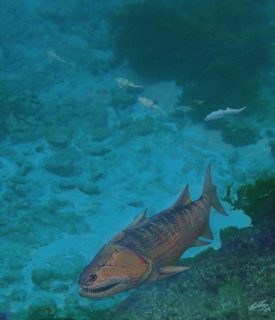 An artist's illustration of an ancient fish, called Guiyu. The recent discovery in China of an unusually intact and ancient fossil fish, the distant ancestor of about 99.7 percent of today's living vertebrates including human beings, has provoked a fresh look at the early evolution of vertebrates. [chinadaily.com.cn]