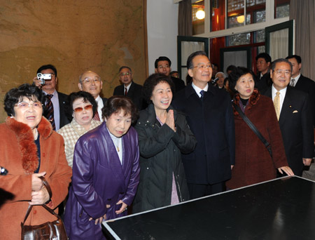 Chinese Premier Wen Jiabao (R3, front) and members of the Japanese war orphans' delegation visit Xihuating, the former residence and office of the late Premier Zhou Enlai, in Beijing, capital of China, Nov. 11, 2009. [Xinhua]