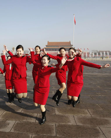 Hostesses pose for pictures in Tian'anmen Square prior to the opening ceremony of the Second Session of the 11th National People's Congress (NPC) at the Great Hall of the People in Beijing March 5, 2009. China's parliament, the National People's Congress, opened its annual session on Thursday, with Premier Wen Jiabao giving his work report and spelling out broad policy goals for 2009. [Agencies]