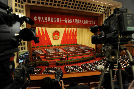 Updated: 2009-03-09 10:51 ![]() The second plenary meeting of the 11th NPC annual session is held in Beijing, capital of China, March 9, 2009. [Xinhua]