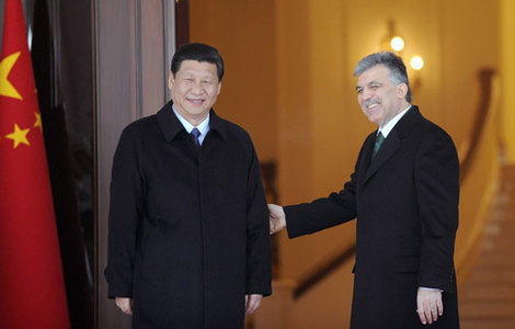 Vice-President Xi Jinping is greeted by Abdullah Gul, the president of Turkey, in Ankara on Tuesday, prior to their meeting. [Liu Jiansheng / Xinhua] |