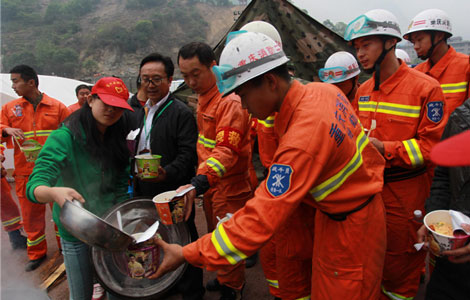 A volunteer provides hot water to rescuers at a middle school used as a temporary service site in quake-hit Baoxing county, Southwest China's Sichuan province, April 22, 2013.