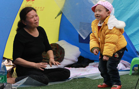Volunteers set up shelters as rain hits Lushan county, Sichuan province, on April 23, 2013. [Photo/Xinhua] |