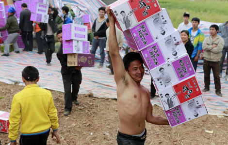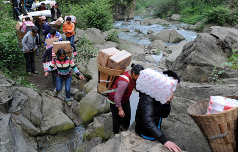 Villagers carrying disaster relief supplies walk in the mountain in quake-hit Shifeng village of Lushan county. The road linking the Shifeng village with the outside had been destroyed by a 7.0-magnitude earthquake. Local villagers set up a 300-member group to climb mountains to get relief supplies outside and then return to the village. Over 40 tons of materials had been transported and distributed to over 2,000 villagers.