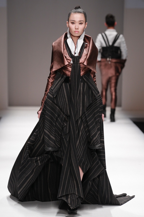 A model presents a creation by a graduate of Xiamen University of Technology during China Graduate Fashion Week in Beijing, April 24, 2013. [Photo/http://www.fashion.org.cn/cgfw/]