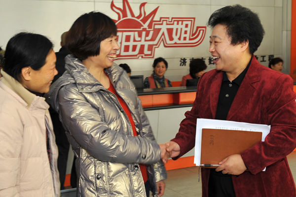 Deputy to People's Congress Zhuo Changli (R) talks with nannies at a housekeeping company called Sunshine Elder Sister in Jinan, capital of East China's Shandong province, Feb 20, 2013. Zhuo has been soliciting views from nannies, rural women, laid-off woman workers and the elderly, and she is going to present her proposal on pension funds and development of the home service industry at the National People's Congress (NPC) in March. Zhuo herself was a laid-off worker in 1993, but she has managed to turn a small hotel into a four-store chain. She was invited to be the chairman and general manager of Sunshine Elder Sister in 2001. [Photo/Xinhua]