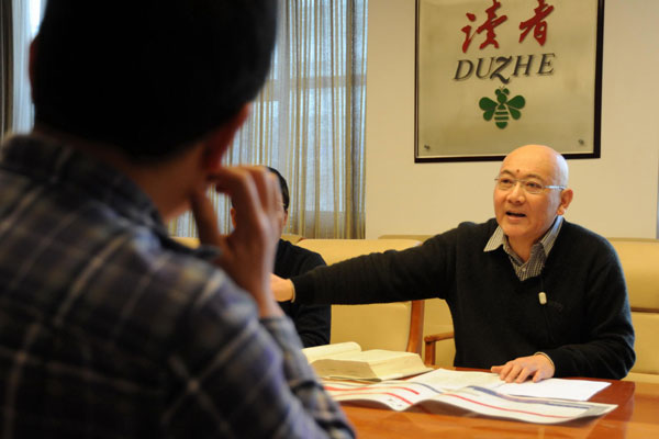 Peng Changcheng (R), deputy to the National People's Congress, discusses editing the magazine with colleagues in Lanzhou, Gansu province on Feb 22. Peng is director of editorial board of the magazine Reader, which is popular among teenagers. Peng prepares proposals on improving the education of teenagers and their psychological wellbeing. [Photo/Xinhua]