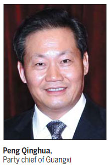 Peng said he will do his best to promote cooperation between Guangxi and Hong Kong, where he has worked for nine years since 2003 at the Liaison Office of the Central People's Government in the Hong Kong Special Administrative Region as deputy director and later, director.