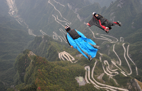 Dancers from the Bandaloop dance troupe of the United States perform sky ballet near a skyscraper in east China's Shanghai Municipality, Oct 14, 2015. The performance is part of the warm-up for the 17th Shanghai International Arts Festival, which will last from Oct 16 to Nov 16. [Photo/Xinhua]