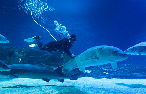 Chinese sturgeon Houfu swims in Beijing Aquarium, November 16, 2015. Houfu is the biggest wild Chinese sturgeon found in the last 20 years. It was found occasionally by a fisherman in the Yangtze River Basin on November 15, 2014 when suffering from multiple injuries, and was immediately sent to Yangtze River Fisheries Research Institute for treatments. [Photo/IC]