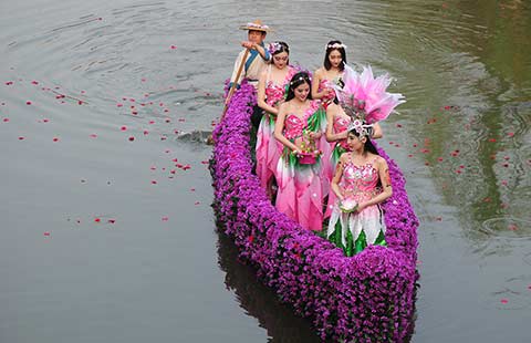 Female university students participate in a Coming of Age ceremony in Songcheng scenic spot in Hangzhou, Zhejiang province, on Monday. They held the ancient traditional ceremony of kowtowing to ancient god and releasing festive lanterns in the river in Han Chinese clothing to celebrate International Women's Day on March 8. [Photo/IC] |