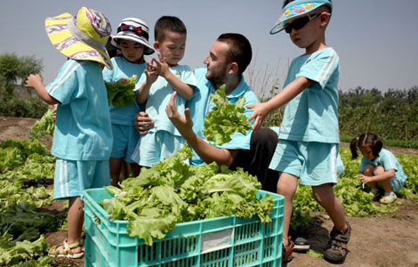 Teachers with the Golden Kids International School in Beijing, teaches children to identify vegetables in a vegetable garden on Aug 9, 2013.