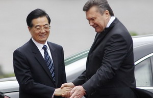 President Hu Jintao is welcomed by his Ukrainian counterpart Viktor Yanukovych in Kiev Monday during a three-day visit to Ukraine. Hu is the first Chinese head of state to visit Ukraine in the past decade.