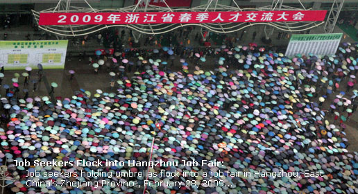Job seekers holding umbrellas flock to a job fair at Hangzhou Peace International Convention & Exhibition Center, Hangzhou, East China's Zhejiang province, February 28, 2009. About 1,300 employers have set up booths at the job fair that offers 26,000 jobs. [Xinhua]