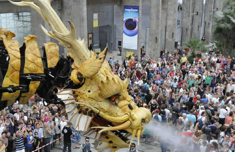People gather around the mechanical horse dragon Long Ma during its performance in Nantes, France, on Aug 22, 2015. Long Ma was made in 2014 by French production company La Machine to celebrate the 50th anniversary of diplomatic relations between France and China. [Photo/Xinhua]