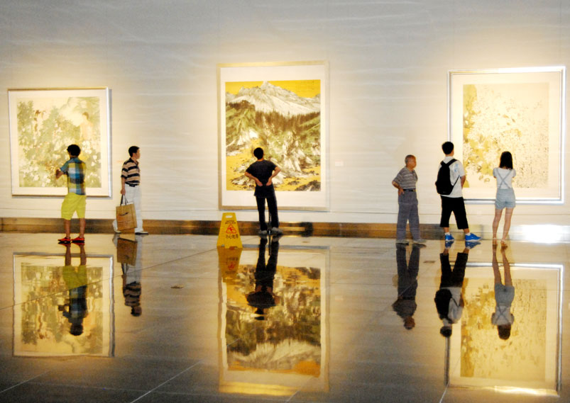 • 十七屆六中全會2011年10月15日至18日在北京舉行,審議通過《中共中央關(guān)于深化文化體制改革、推動社會主義文化大發(fā)展大繁榮若干重大問題的決定》。圖為2012年7月6日,南京,觀眾在江蘇省美術(shù)館欣賞展出的作品。(王躍武 攝)