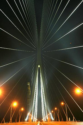 Updated: 2008-06-30 15:09 ![]() 中國日報網(wǎng)環(huán)球在線消息:世界第一大跨徑斜拉橋蘇通大橋今天上午10時許在南通市正式順利建成通車。江蘇省省委書記梁保華、省長羅志軍等省市領(lǐng)導(dǎo)出席了今天的開通儀式。 蘇通大橋橫跨蘇州(常熟)和南通兩市,西距江陰大橋82公里,東距長江入???08公里,是國家高速公路沈陽至??谕ǖ赖倪^江樞紐,也是江蘇省公路主骨架重要的過江節(jié)點。 蘇通大橋的建設(shè),創(chuàng)造了世界橋梁建設(shè)最深基礎(chǔ)、最高橋塔、最長拉索、最大主跨四項世界紀(jì)錄,代表了世界建橋技術(shù)的最高水平。大橋路線全長32.4公里,其中跨江大橋長8146米,大橋主橋為跨徑1088米的斜拉橋,是世界最大跨徑的斜拉橋,此前最大跨徑斜拉橋的跨徑為890米;主墩基礎(chǔ)由131根長約120米、直徑2.5至2.8米的群樁組成,是世界規(guī)模最大、入土最深的群樁基礎(chǔ);橋塔采用高300.4米的混凝土塔,為世界最高橋塔;大橋最長拉索長達577米,為世界最長拉索。 ![]() 5月25日,北京奧運會圣火在新建成的蘇通長江公路大橋上傳遞,標(biāo)志著蘇通大橋?qū)崿F(xiàn)試通車。江澤民同志為大橋題寫了橋名。試通車以來,蘇通大橋大大緩解了京滬高速公路和江陰長江大橋的壓力。 蘇通大橋建成通車,圓了南通人民的千年期盼和百年夢想。現(xiàn)在,從大橋過江只要7分鐘,南通到上海的車行時間比過去從汽渡過江縮短了1個小時左右,由此南通將快速融入蘇南板塊。同時,整個蘇中、蘇北地區(qū)與上海的時空距離也都大大縮短,跨入了與上海、蘇南“無縫對接”的時代。蘇通大橋的建成,對于完善國家和江蘇省高速公路網(wǎng)絡(luò)、緩解過江交通壓力,對于加強長江南北之間的交通和經(jīng)濟聯(lián)系、主動接受上海輻射、推動長三角經(jīng)濟一體化都具有十分重要的意義。 編輯:鄧京荊 來源:新華報業(yè)網(wǎng) 沈偉