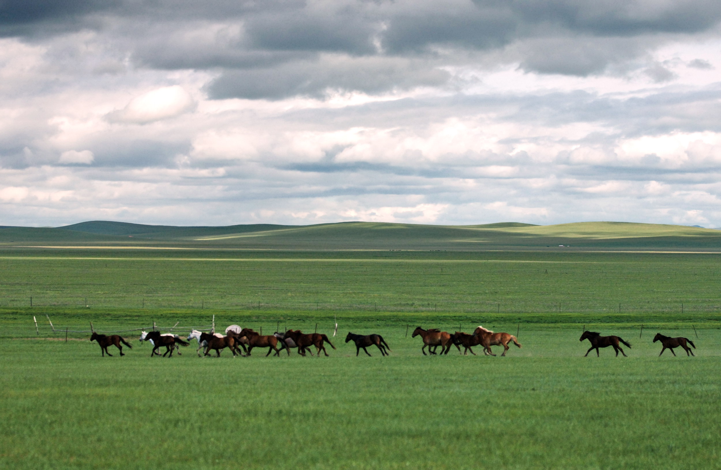 馬匹在內(nèi)蒙古呼倫貝爾草原天然草場奔跑(7月21日攝)。