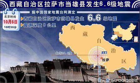 中國(guó)日?qǐng)?bào)網(wǎng)環(huán)球在線消息:據(jù)國(guó)家地震臺(tái)網(wǎng)測(cè)定,北京時(shí)間2008年10月6日16時(shí)30分,在西藏自治區(qū)拉薩市當(dāng)雄縣(北緯29.8度,東經(jīng)90.3度)發(fā)生6.6級(jí)地震,震源深度8公里。震中距拉薩市約82公里,距日喀則市約150公里。