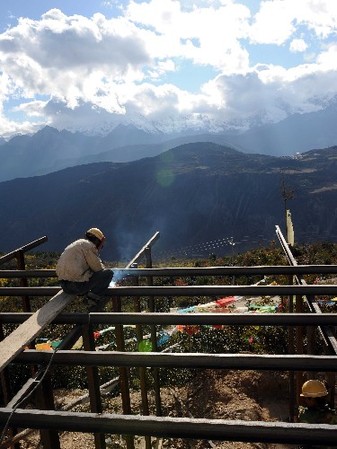 兩名工人在云南省迪慶藏族自治州德欽縣梅里雪山腳下搭建觀景臺(10月14日攝)。(新華社記者 藺以光 攝)