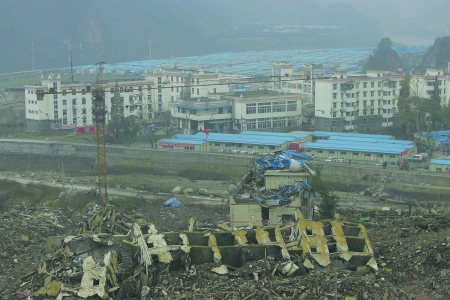 昨(11)日,映秀,廢墟依然被封控不允許入內(nèi),遠(yuǎn)處已經(jīng)建成成片的板房。 王勤攝