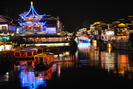 1月23日,夫子廟前秦淮河上燈景絢麗。當(dāng)晚,2009年南京夫子廟燈會(huì)亮燈,夫子廟及秦淮風(fēng)光帶一線彩燈齊放,景色迷人。本屆南京夫子廟燈會(huì)以“水陸并進(jìn)”的格局布展,除50多組大型燈景外,大年初一還將有40萬(wàn)盞傳統(tǒng)燈彩參展。 (新華社記者孫參攝)