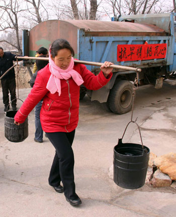 2月3日,在河南省博愛縣寨豁鄉(xiāng)白坡村,村民葛文霞挑著“解困水”回家。 2008年10月以來,河南大部分地區(qū)出現(xiàn)不同程度的旱情,地處山區(qū)的博愛縣寨豁鄉(xiāng)面臨人畜飲水困難。該縣財政撥付抗旱資金,同時開展縣直單位對口幫扶活動,為山區(qū)群眾送錢送水,保證群眾基本生活用水。 新華社發(fā)(程全 攝)